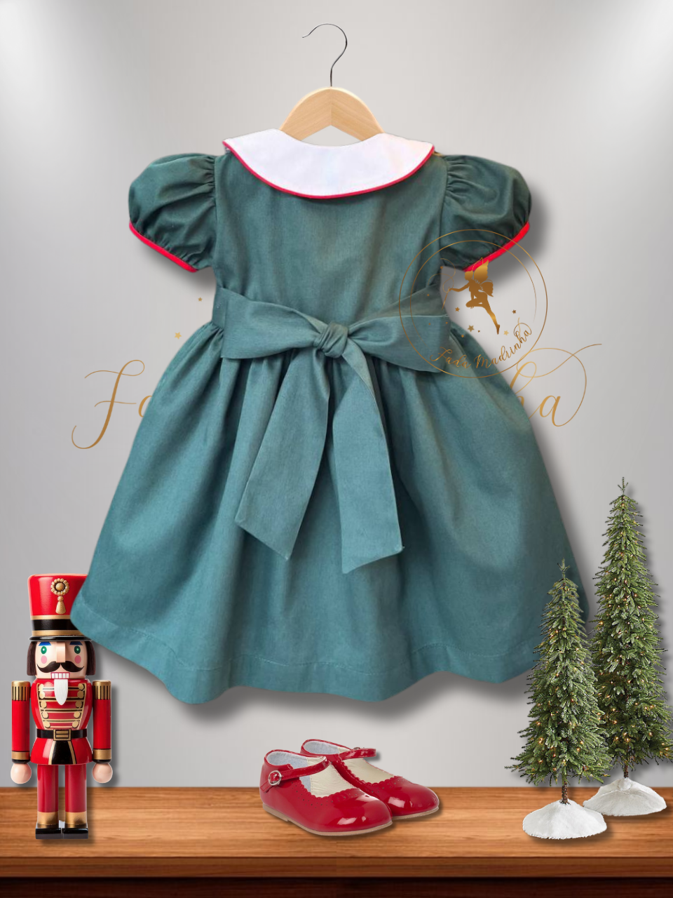O fechamento frontal com botões vermelho, que percorre todo o comprimento do vestido, adiciona um charme vintage irresistível. A saia franzida e o faixas para ajuste ao corpo e laço nas costas preservam a silhueta original — prometendo as mesmas voltas alegres que encantavam as crianças de outrora.